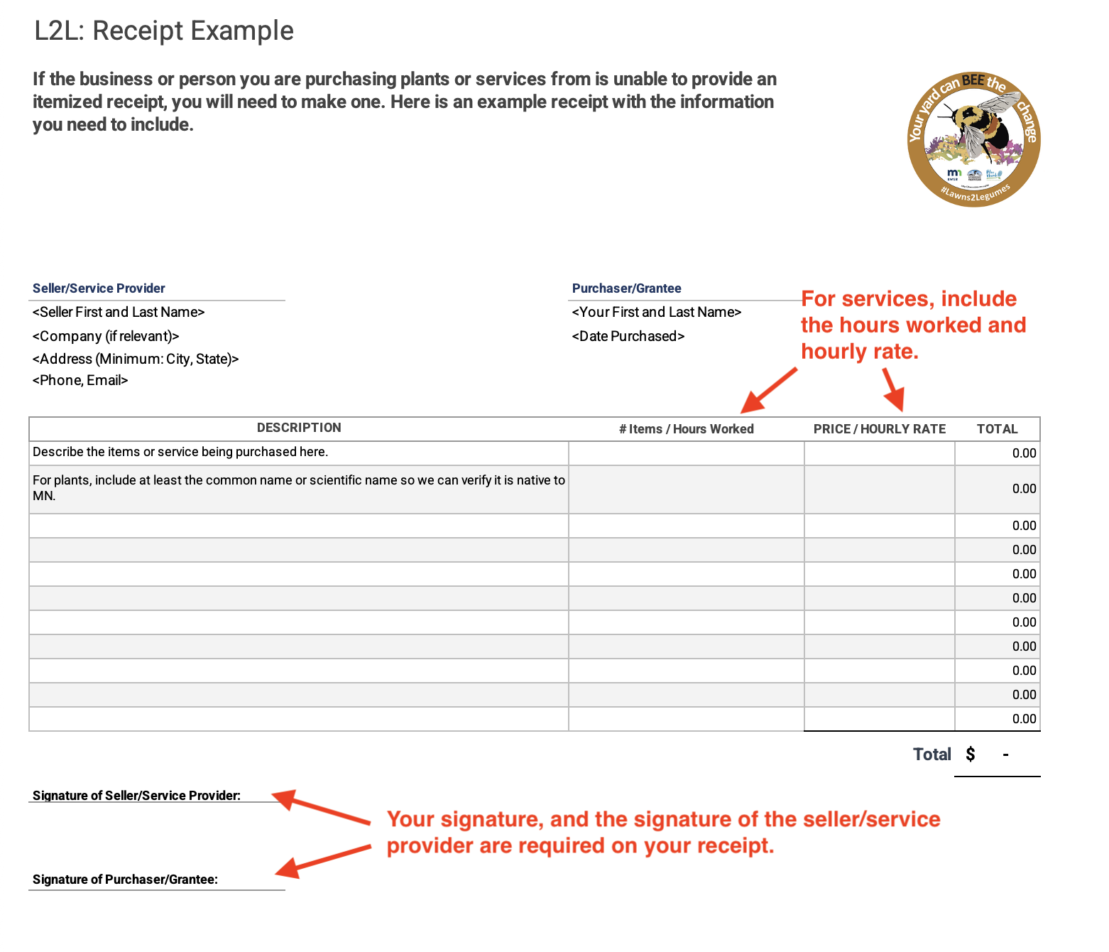 Track the total expenses spent on your project, including any expenses beyond the amount you request reimbursement for. (This will help us demonstrate the many outcomes of the Lawns to Legumes program!) You will need to share this information when filling out the Reimbursement Request Form.